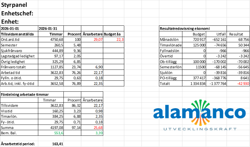 Alamanco har utvecklat en styrpanel för att analysera sambanden mellan schematid, bemanning, arbetade timmar, budget och ekonomiskt resultat.